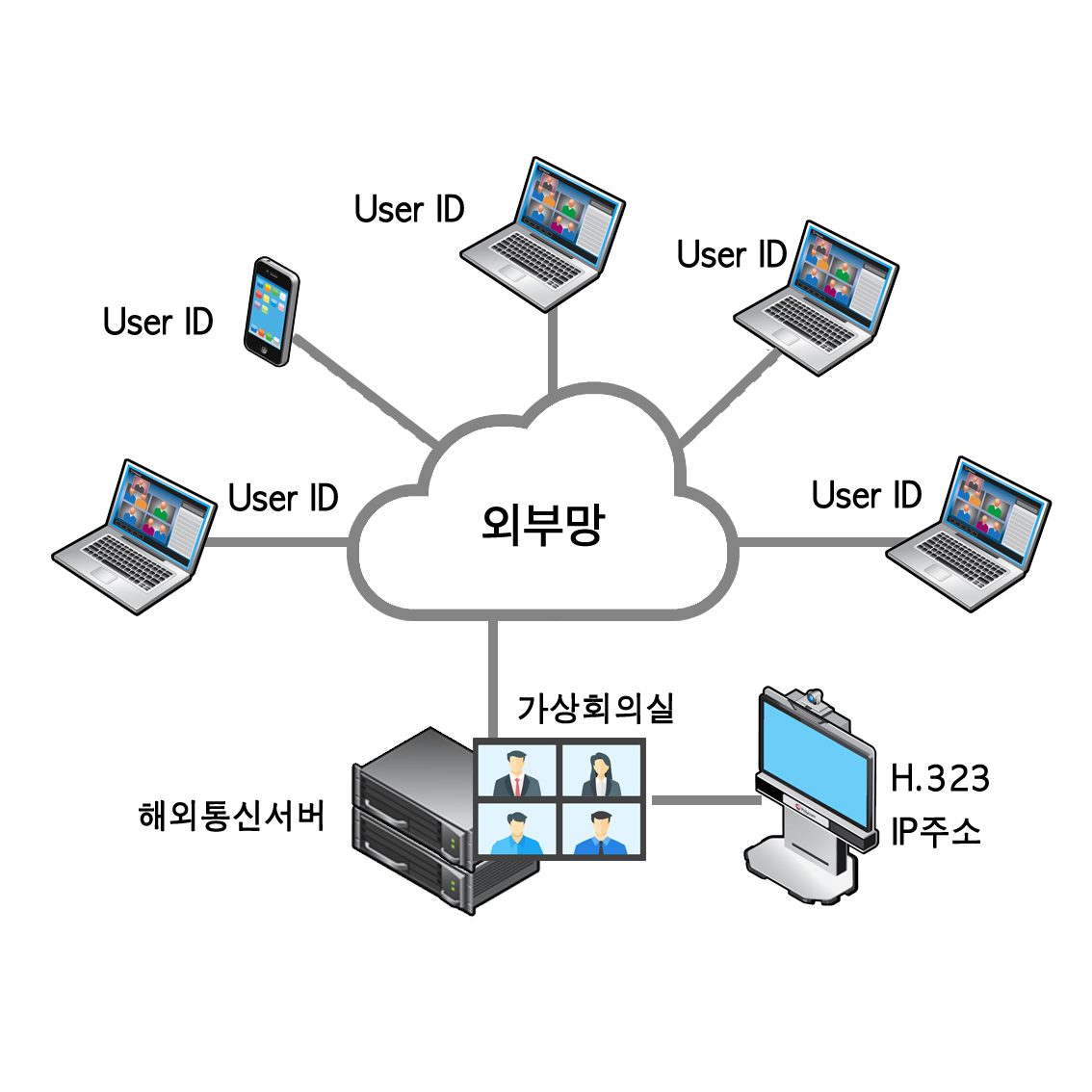 화상장비는 기본적으로 "단말기" 형태이므로 별도의 다자간 동시접속 방법이 필요합니다.